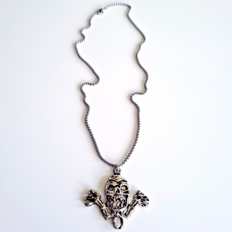 Halsband med döskalle. Mått ca 5 x 4,5 cm. Nickelfri kedja i rosfritt stål. Silverfärgad. Längden är 50 cm.