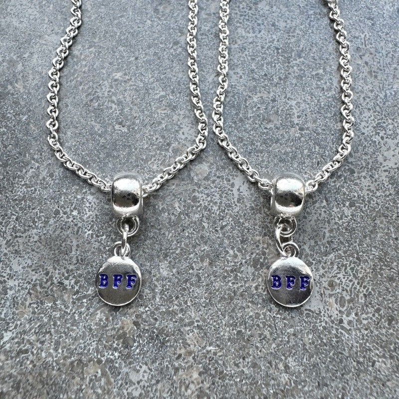 Halsband Best Friends Forever BFF x 2. Med lila text. Ett till dig och ett att ge till bästa vännen. Kedjan är i ljus silverfärg och kan justeras från ca 40 - 45 cm. Nickelfritt.