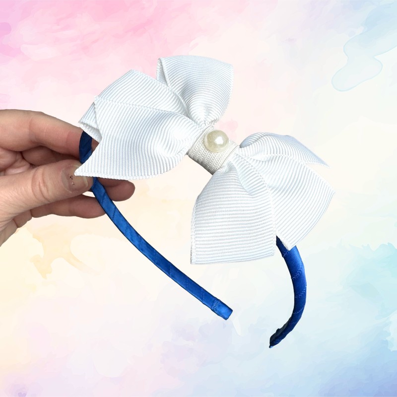 Diadem blåvitt med rosett. Med en pärla som detalj.