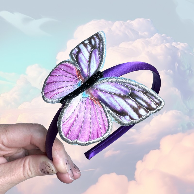 Diadem med stor vacker fjäril. Med lite glitter i trådarna. Lila satintyg på bågen. Fjärilen är i blandade lila och rosa färger. Matcha gärna med 2653.