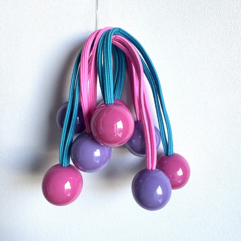 Hårsnoddar färgglada med bollar. Ett par. Välj mellan rosa/lila eller turkos/cerise.