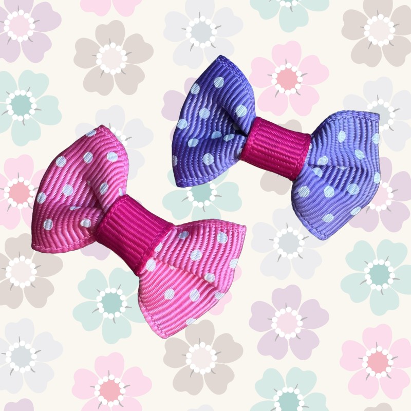 Hårspänne mini med prickig rosett. Välj mellan rosa eller lila färg med vita prickar. Rosetten är ca 4 cm. Spännet är 3 cm och ett krokodilklipp, också i rosa. Nickelfritt. Till dom minsta barnen.