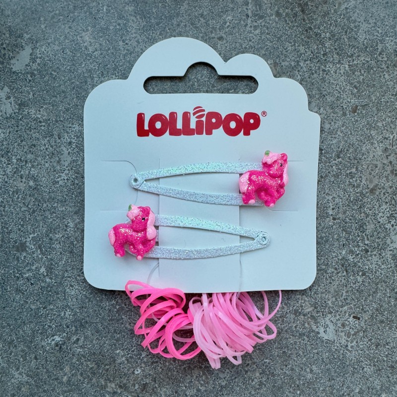 Hårspännen med enhörning och minisnoddar. Vita hårspännen med glitter. Även glitter på enhörningen. Minisnoddarna är ca 1,5 cm i diameter och 30 stycken till antal, i tre olika rosa nyanser. Nickelfritt.